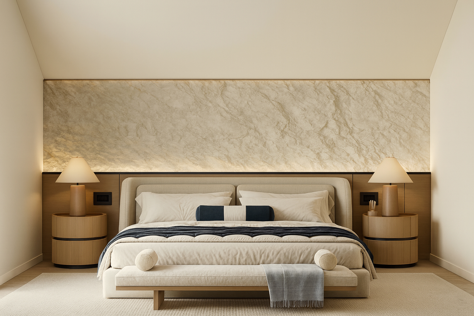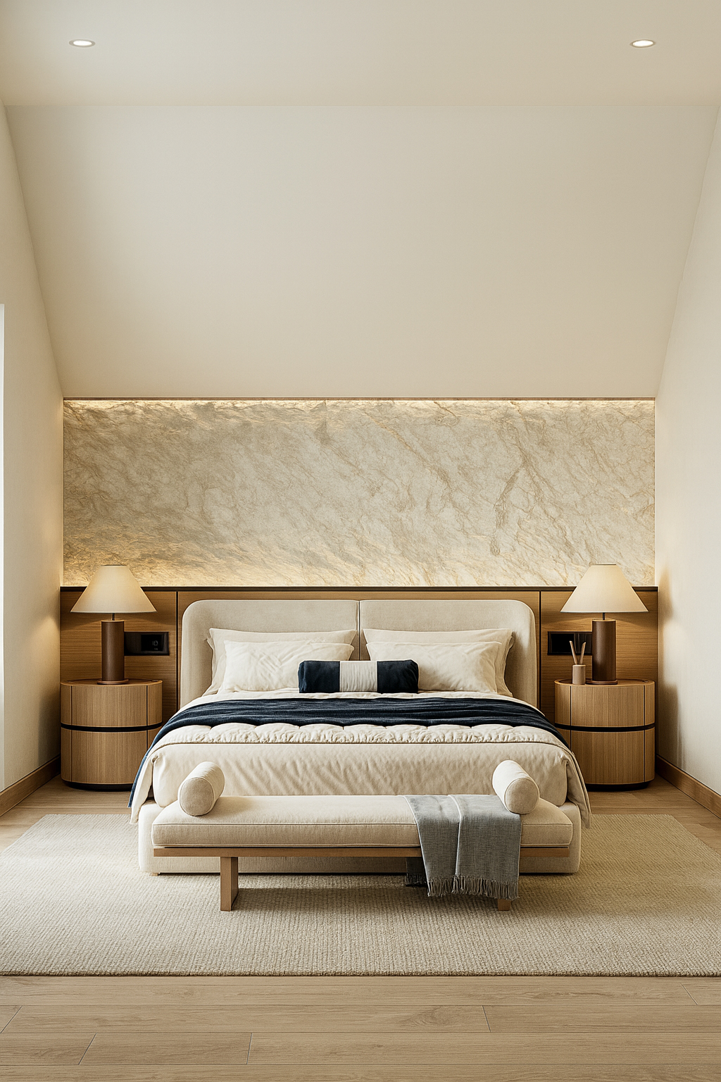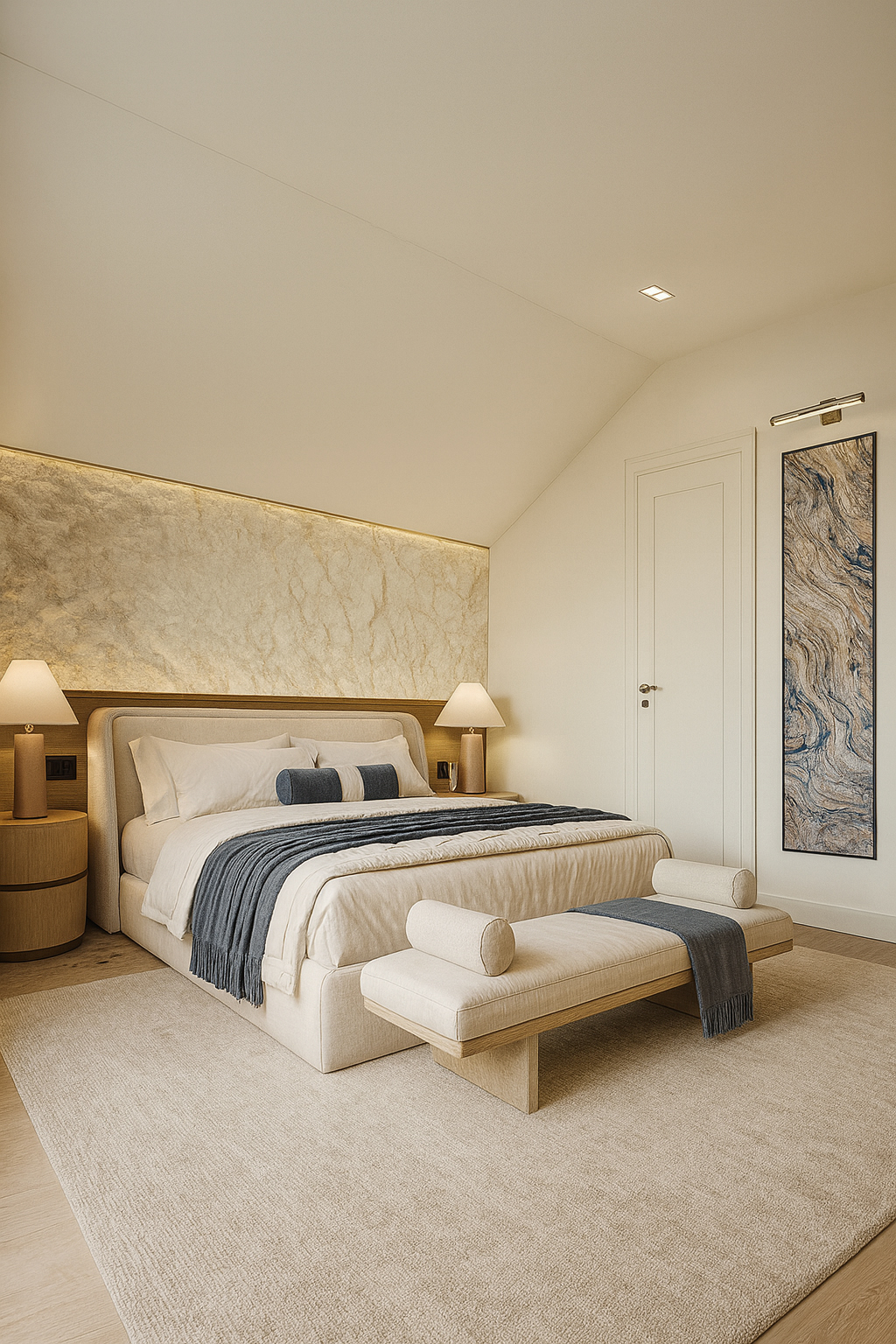 Monochrome neutrals and honeyed oak set an airy studio mood. A monolithic wall-to-wall desk and flush cabinetry erase visual noise, while cove lighting washes acoustic panels in a gentle glow. A sculptural lounge corner and tactile artwork invite pause—balancing deep work with replenishing stillness.