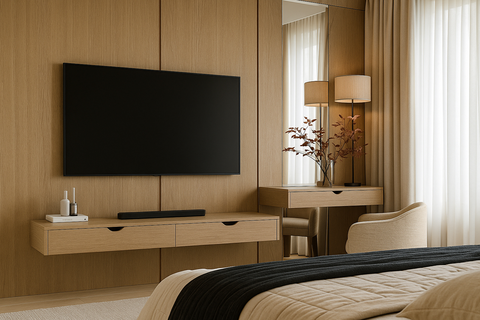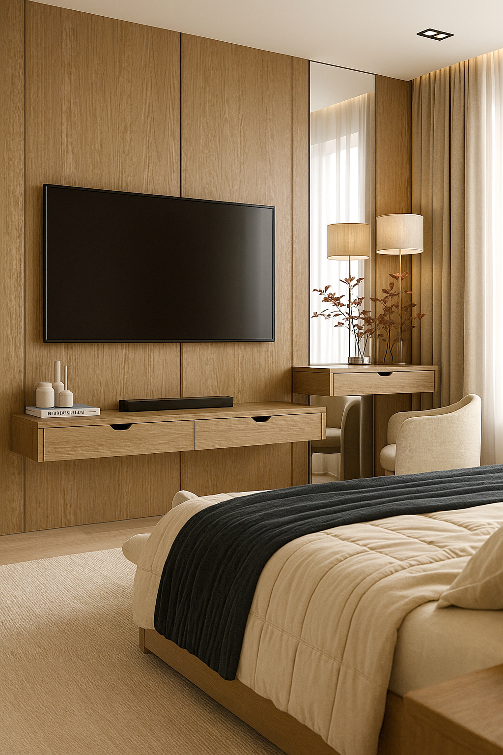 Calmed by beige tones and honey oak, this workspace sets a soft rhythm with acoustic fabric panels and perimeter concealed LEDs. Built-in storage with open niches keeps order, while the wall-to-wall worktop supports flexible tasks. A side reading nook, textured rug, and curated art add tactile warmth and inspiration.