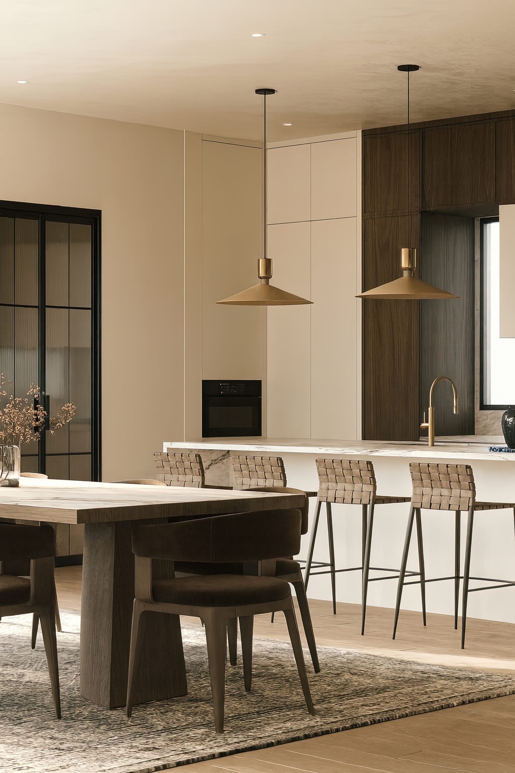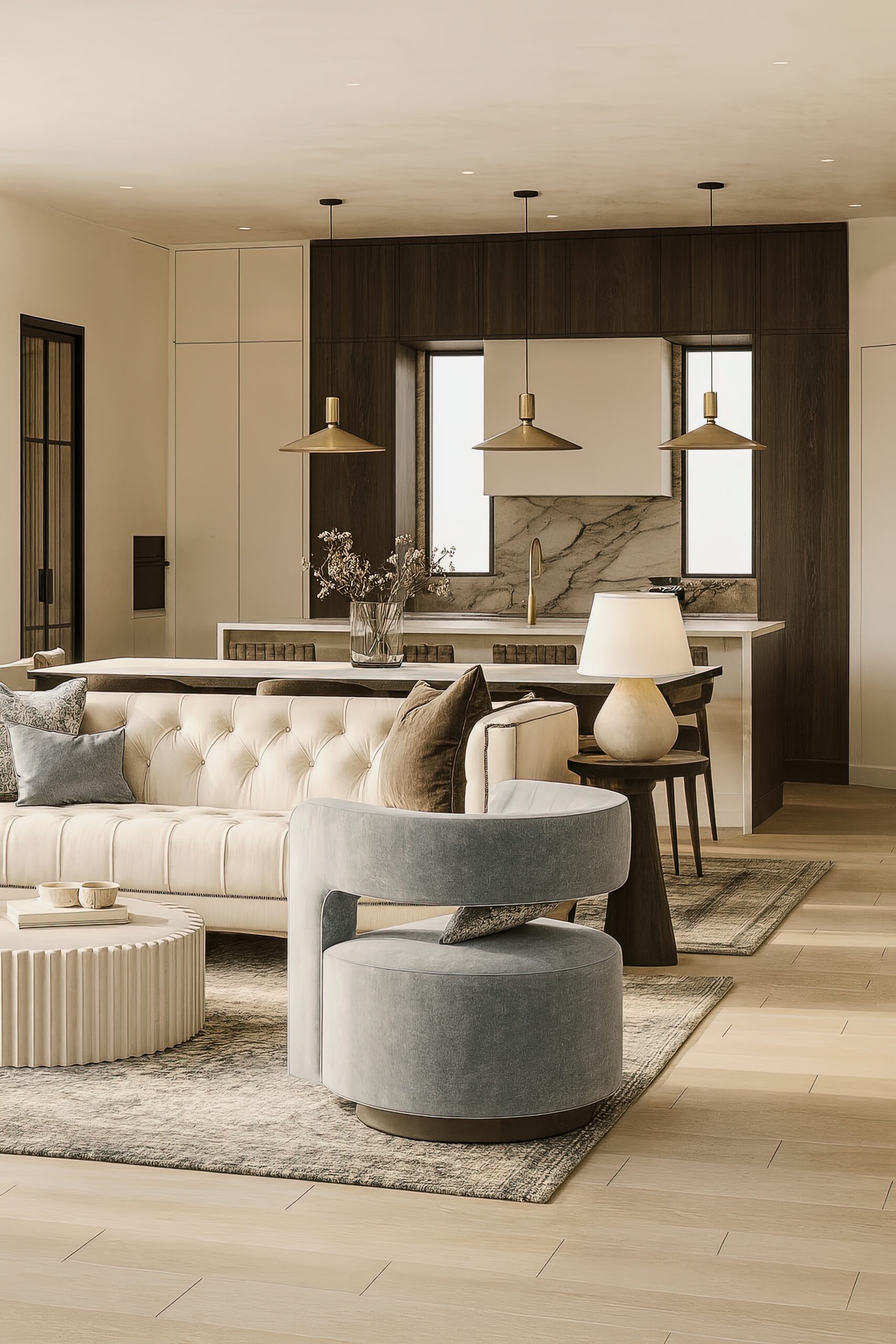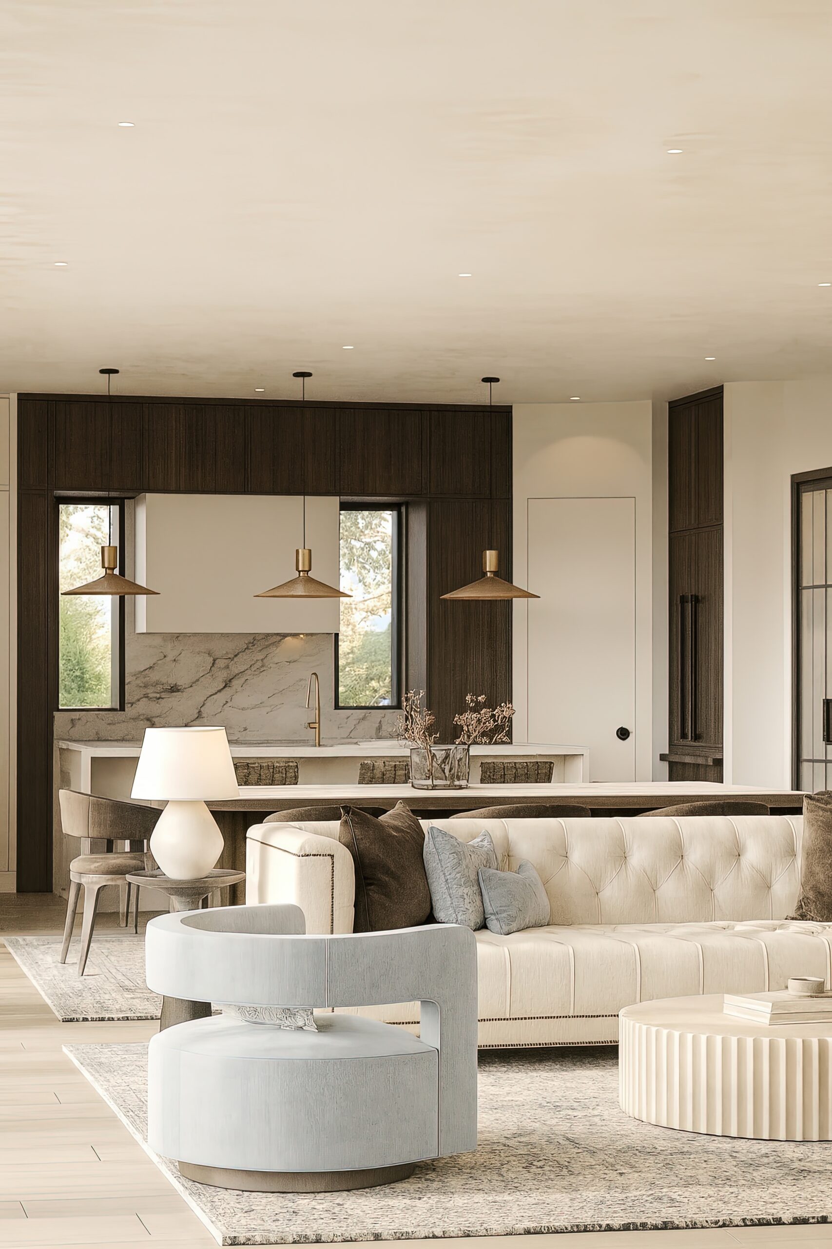 We anchored the open-plan with a continuous walnut millwork spine and a honed marble splash/bench. Cabinetry runs to the ceiling for clean lines and hidden storage; appliances are paneled. A neutral base—ecru linen sofa, oak flooring, matte plaster—allows brass pendants and smoky-blue swivel chairs to lift the palette. Symmetrical layouts, fluted coffee table, and woven-leather stools add rhythm and tactility. Layered lighting (recessed, pendants, table lamps) softens edges and frames vignettes. Durable performance fabrics and protected natural finishes ensure everyday resilience without sacrificing elegance.