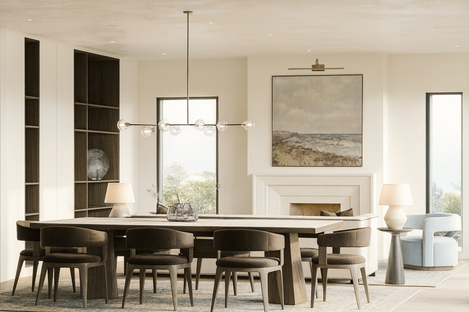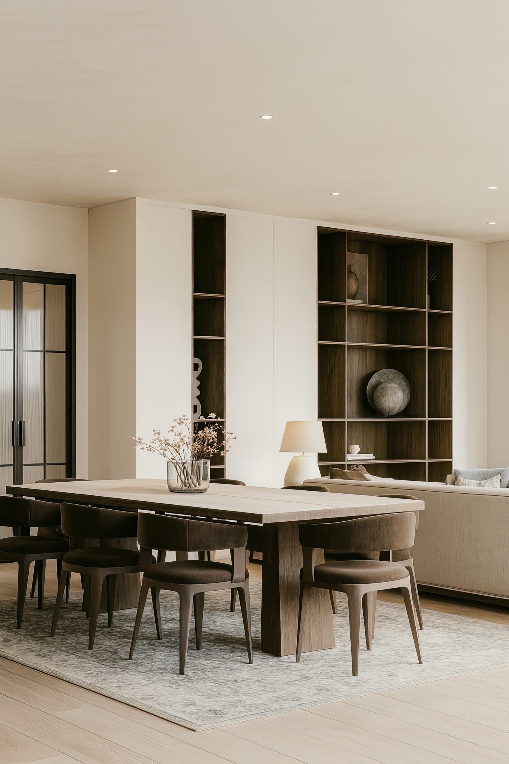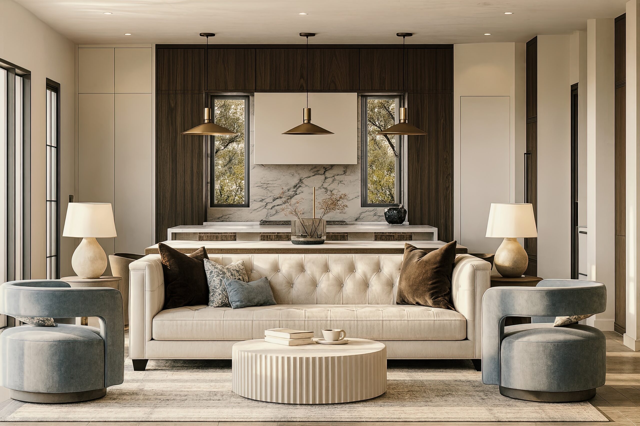 We anchored the open-plan with a continuous walnut millwork spine and a honed marble splash/bench. Cabinetry runs to the ceiling for clean lines and hidden storage; appliances are paneled. A neutral base—ecru linen sofa, oak flooring, matte plaster—allows brass pendants and smoky-blue swivel chairs to lift the palette. Symmetrical layouts, fluted coffee table, and woven-leather stools add rhythm and tactility. Layered lighting (recessed, pendants, table lamps) softens edges and frames vignettes. Durable performance fabrics and protected natural finishes ensure everyday resilience without sacrificing elegance.