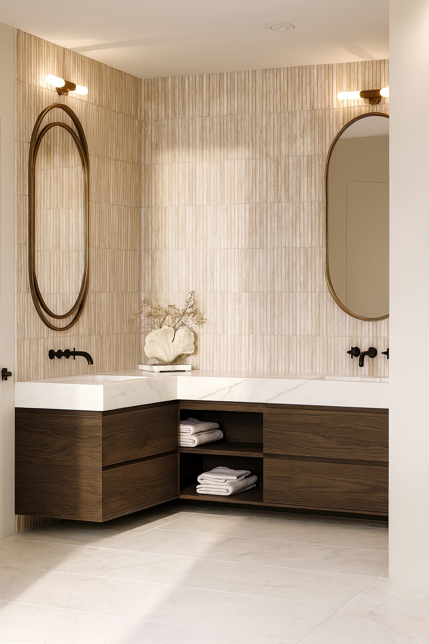 An adaptive home where light, proportion, and material lead. Calm neutrals meet walnut, stone, and brass; arched niches honor heritage while sculptural seating and opal pendants frame tomorrow. Invisible tech and seamless storage keep lines pristine. Islands and modular lounges flex from work to gathering—quiet, timeless, and unmistakably future-ready.