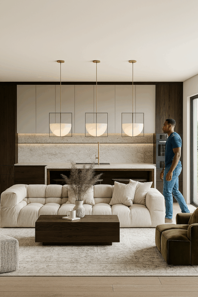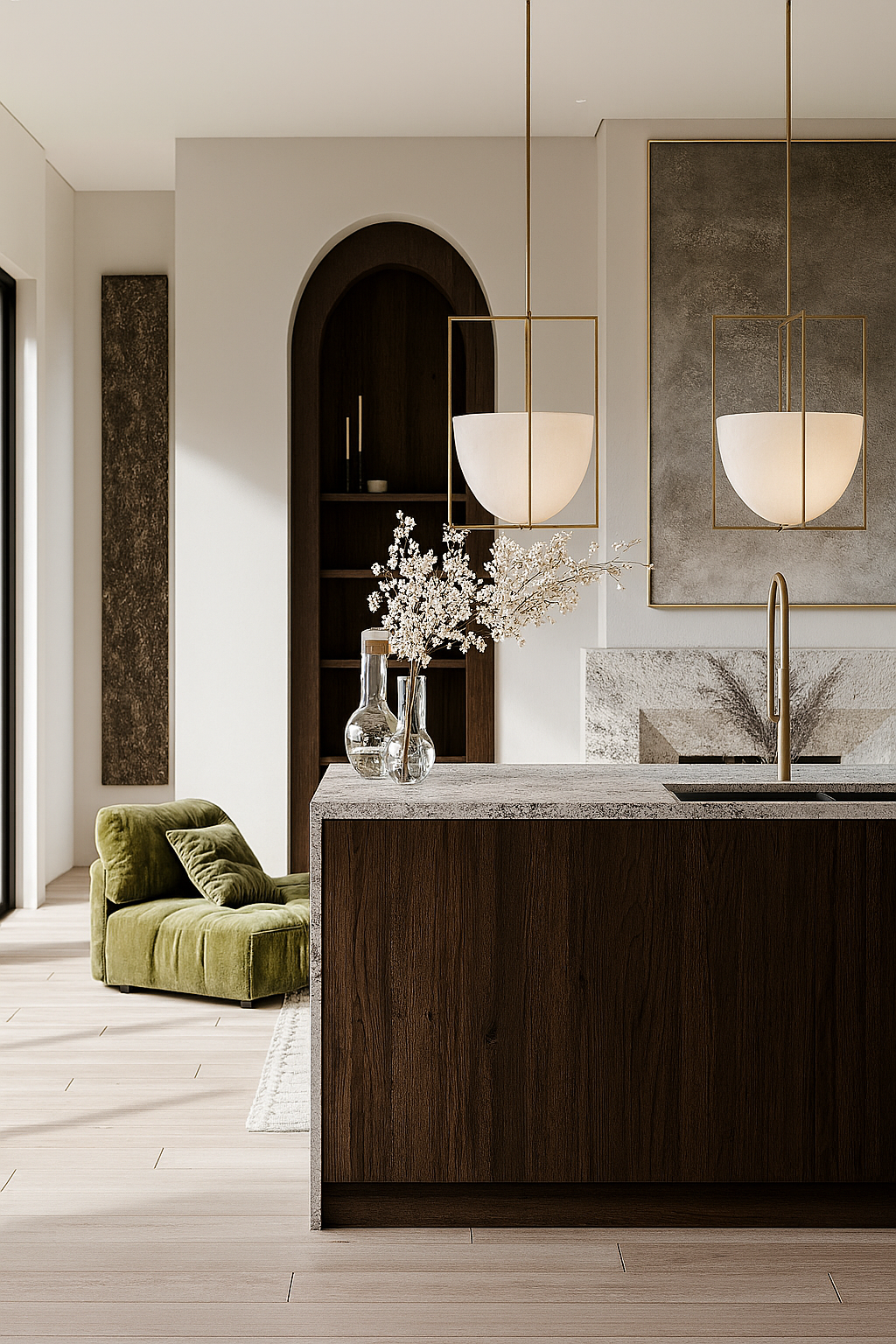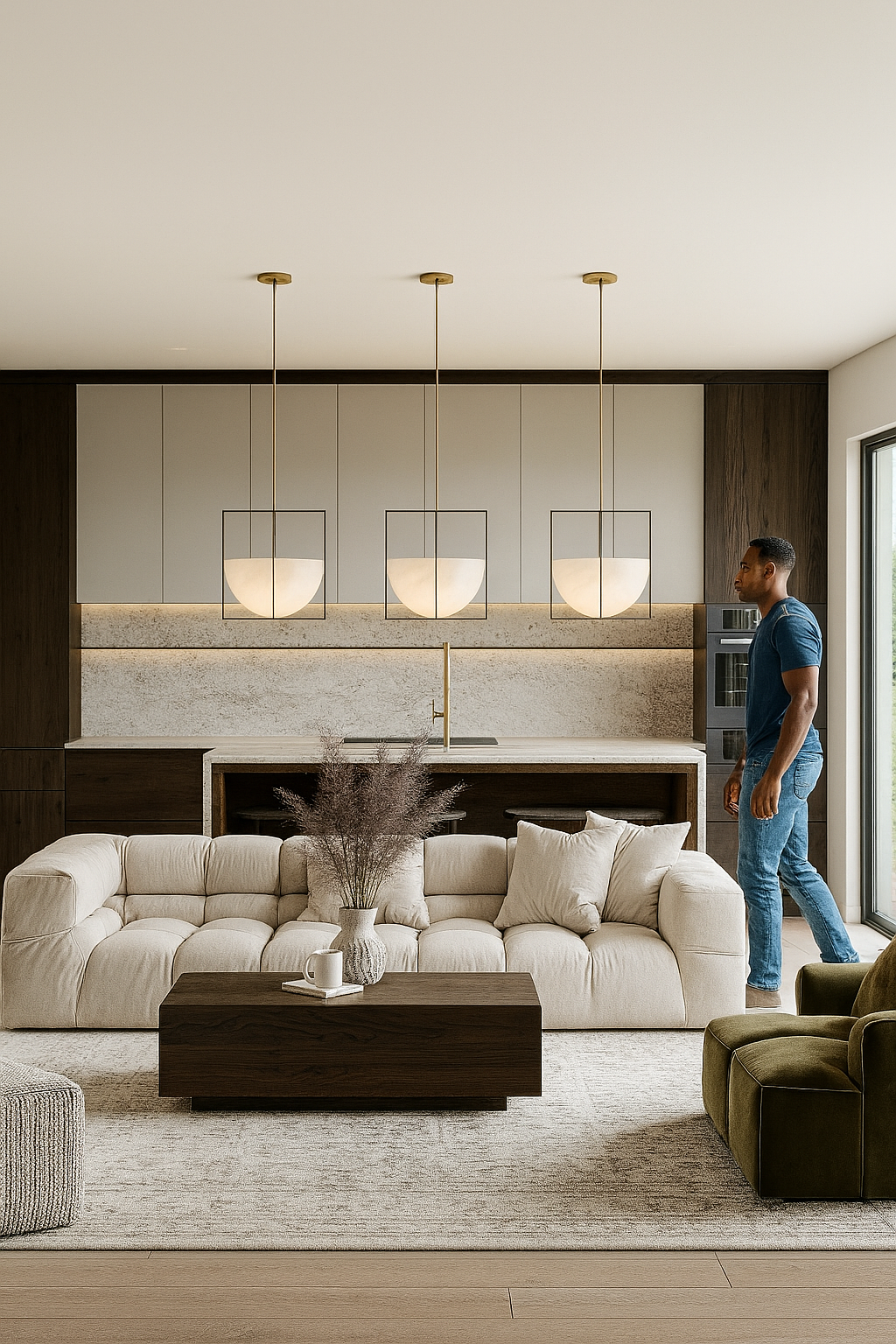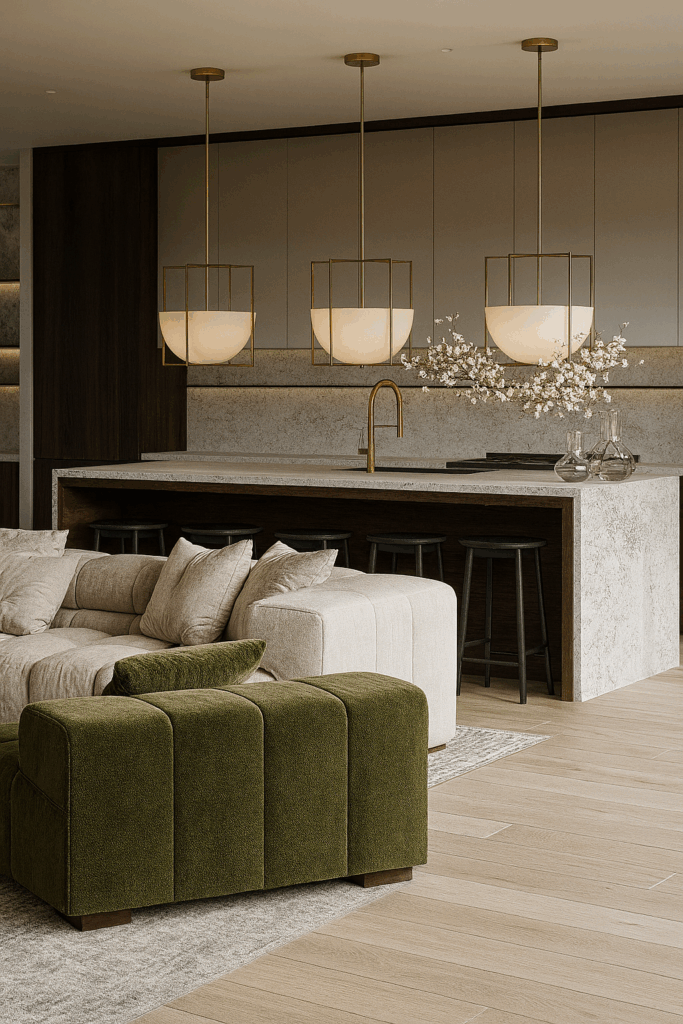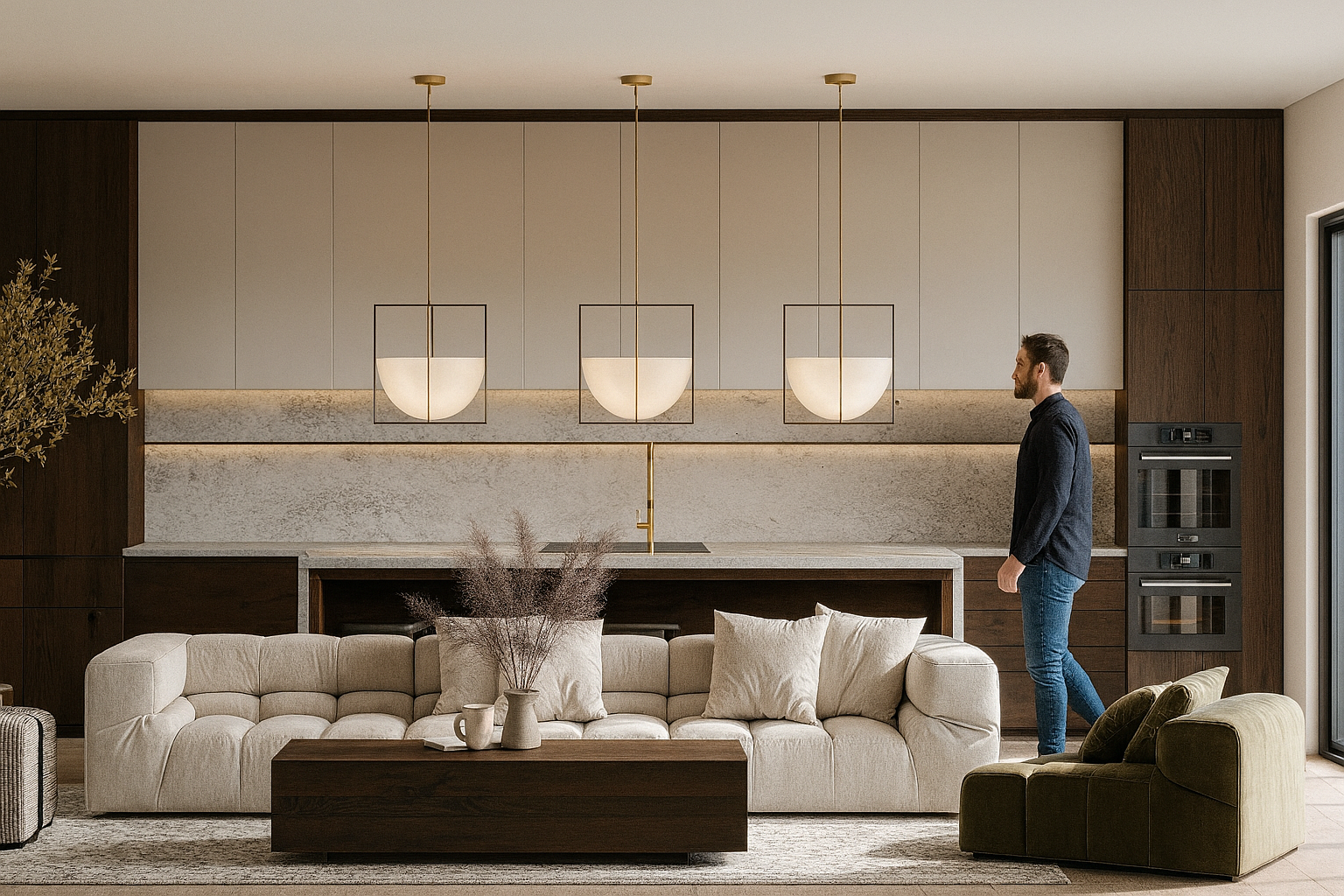 honed stone forms a continuous backsplash and waterfall island; handleless dark walnut millwork with integrated pulls, shadow gaps, and flush skirting keeps lines crisp. Layered lighting pairs square-framed opal pendants with concealed linear LEDs that softly wash the stone. Appliances are fully integrated; brushed-brass fixtures warm the palette. Styling anchors the scene with a channel-tufted cream sofa and a moss-green lounge; a heathered rug, linen/bouclé cushions, and a solid-wood coffee table add tactility. Ceramic vessels and textured art finish a calm, quiet-lux atmosphere that reads seamless across the open plan.