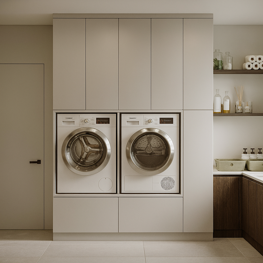 The kitchen concept is “quiet elegance” in an organic-modern language. A calm neutral palette is warmed by walnut millwork, a continuous stone backsplash and countertop with a waterfall island, and brushed-brass accents. Square-framed opal pendants provide task focus while concealed linear LEDs wash the stone and soften shadows. The island anchors prep, serving, and casual seating for three to four. Handleless, flush cabinetry and fully integrated appliances keep sightlines clean; tall storage maintains order. A compact work triangle separates wet, prep, and cooking zones for efficient flow. Material continuity with the living area unifies the open plan, while darker wood grounds the space. The result is timeless, functional, and welcoming—everyday performance with refined, quiet luxury.