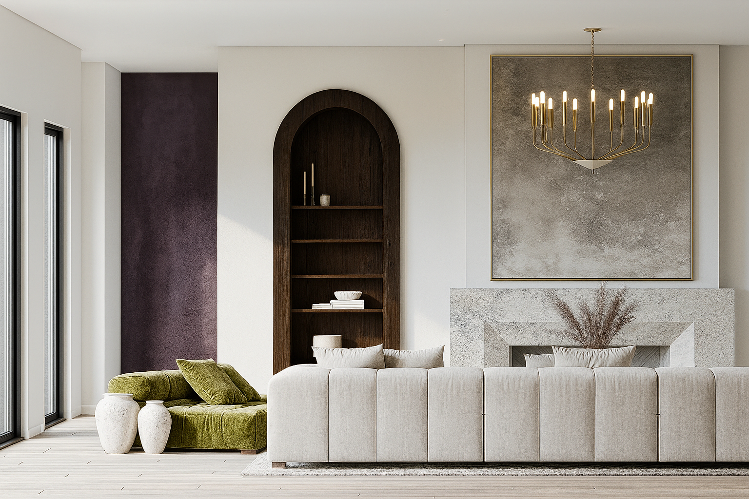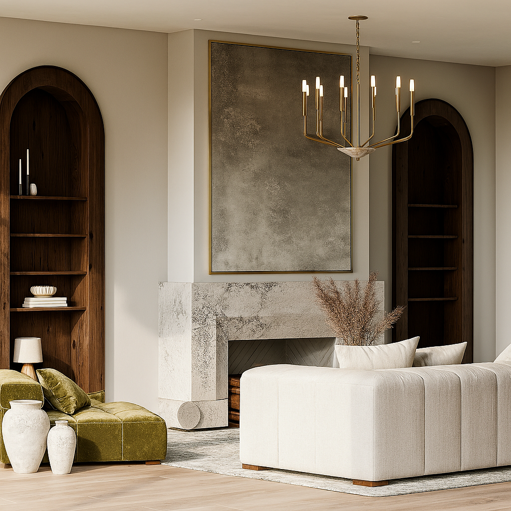 An adaptive home where light, proportion, and material lead. Calm neutrals meet walnut, stone, and brass; arched niches honor heritage while sculptural seating and opal pendants frame tomorrow. Invisible tech and seamless storage keep lines pristine. Islands and modular lounges flex from work to gathering—quiet, timeless, and unmistakably future-ready.