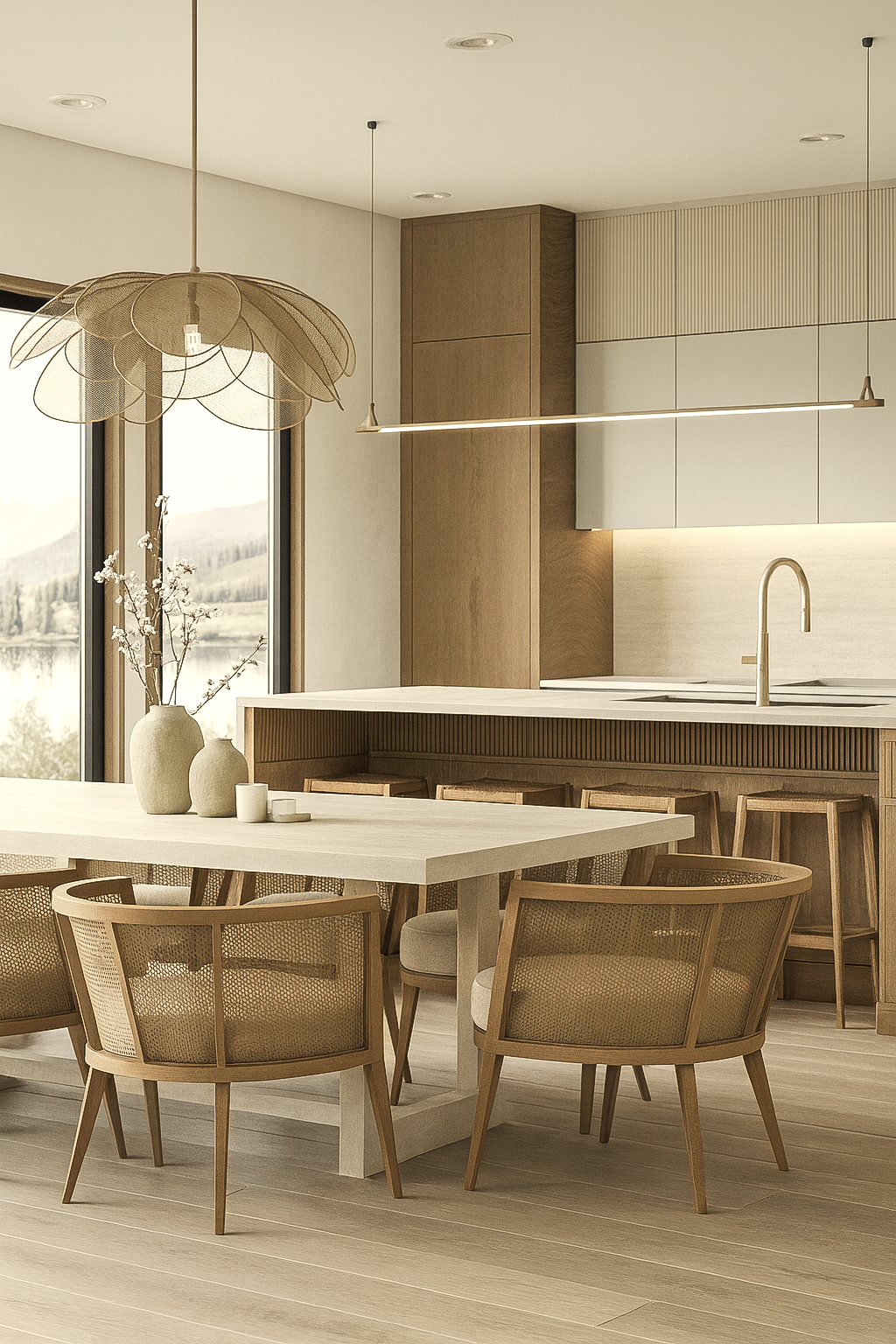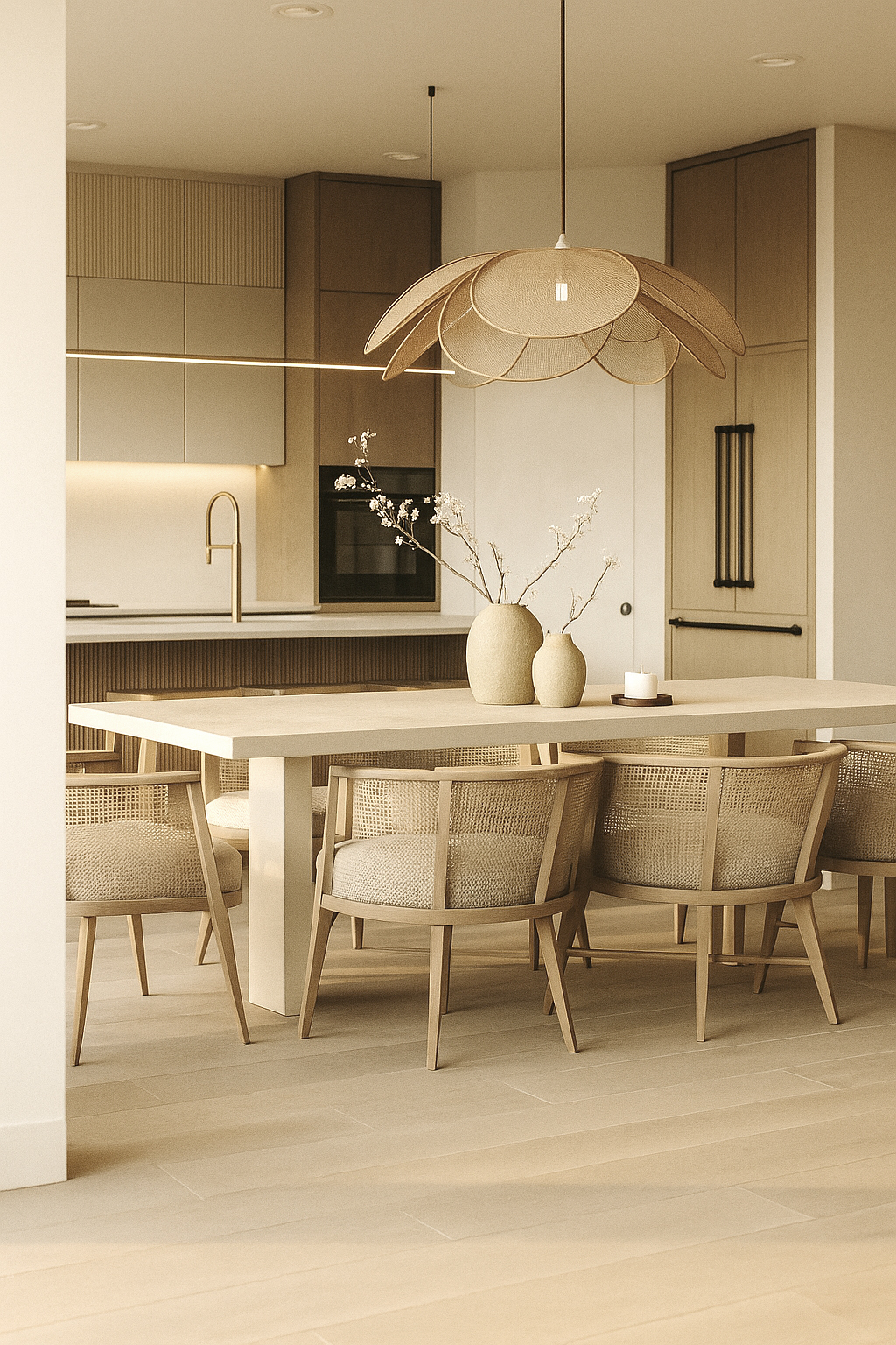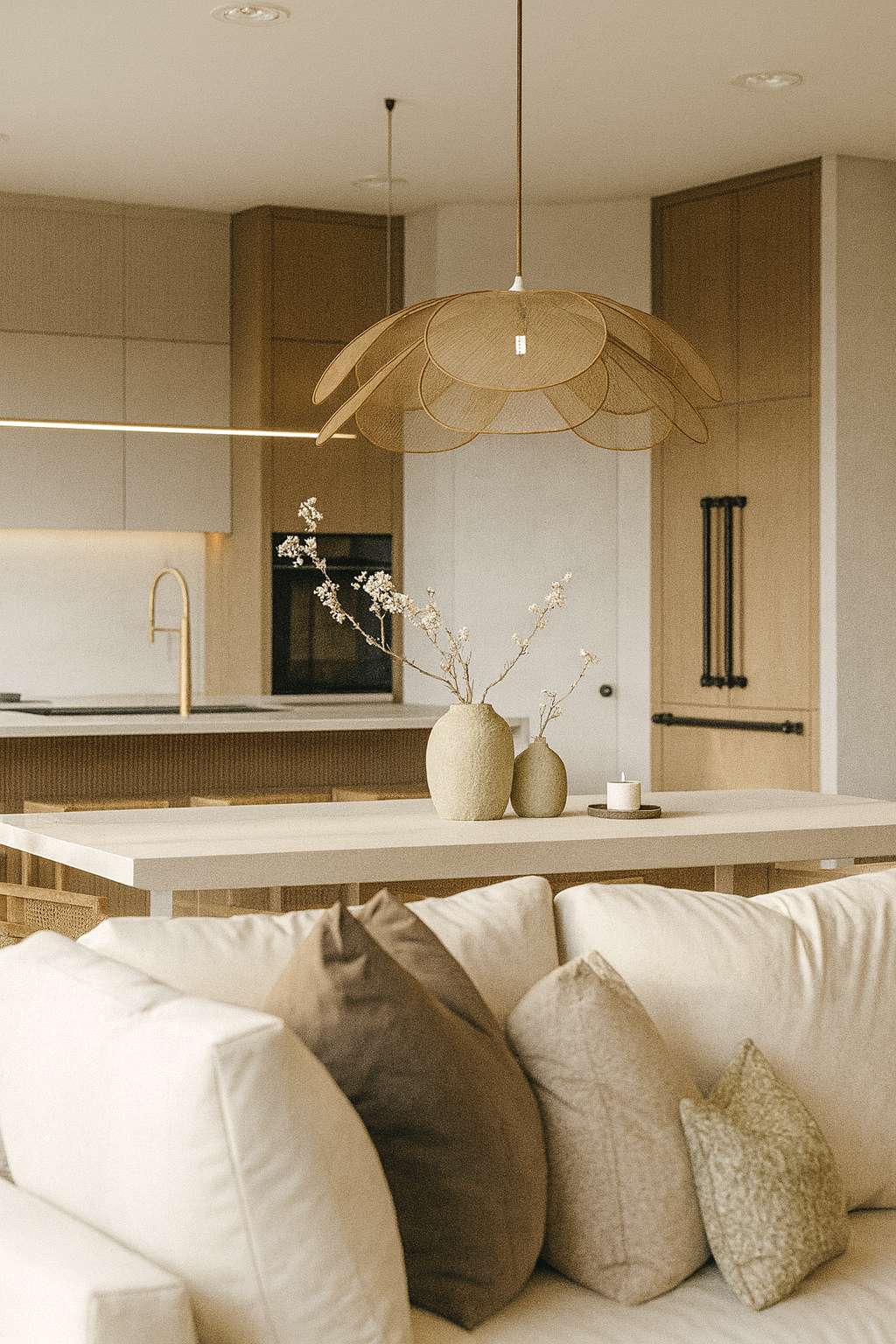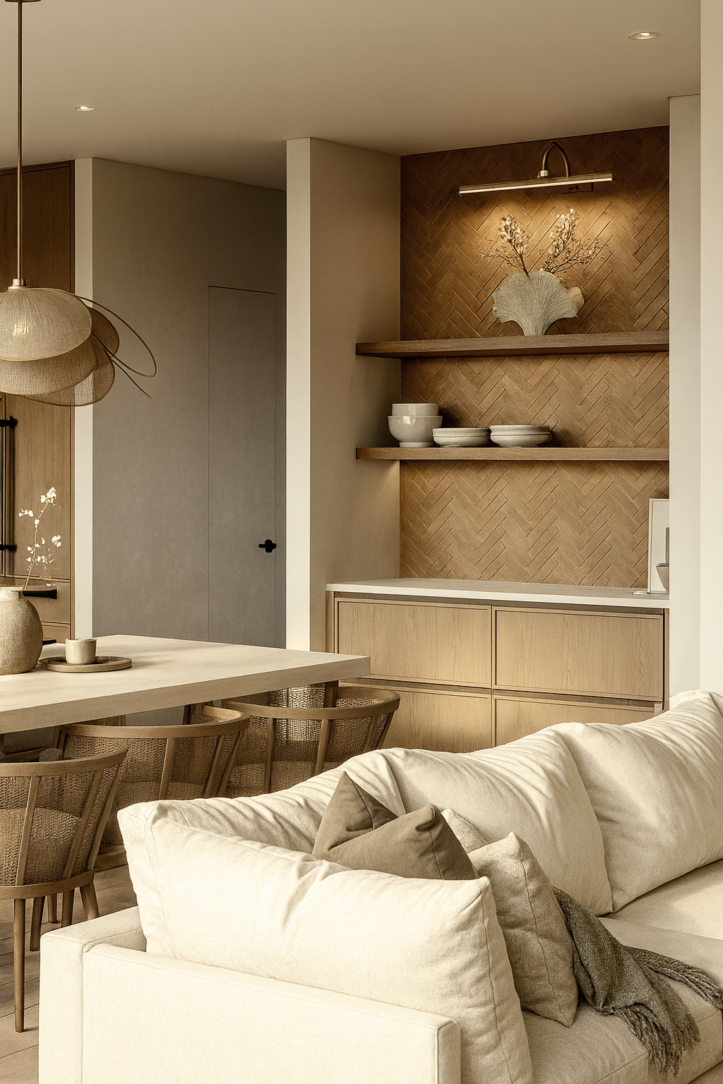 This project combines the warmth of natural materials with the simplicity of modern lines. Light tones and wooden details create a serene atmosphere, while minimal furniture and soft textures add comfort. Lighting and decorative elements bring natural balance, with functionality and timeless aesthetics standing out in the kitchen and bathroom.